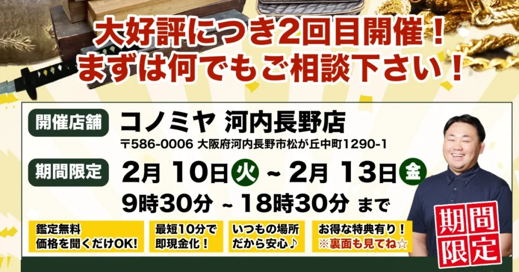 A. ご予約は不要です。 開催時間中でしたら、お買い物のついでなど、いつでもお好きなタイミングでお越しください。お品物が多い場合や、事前のご相談をご希望の場合は、お電話いただけるとよりスムーズにご案内できます。また古物営業法により、買取の際にはご本人様確認が義務付けられておりますので、お越しの際にはご本人様確認書類(運転免許証、健康保険証、マイナンバーカードなど)を一つお持ちください。