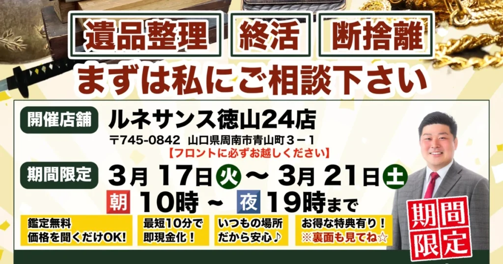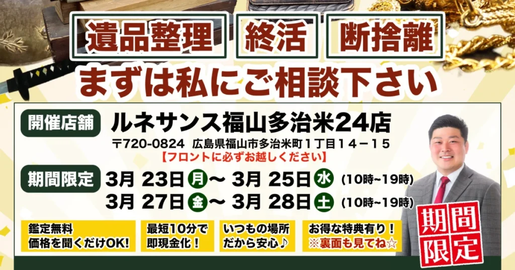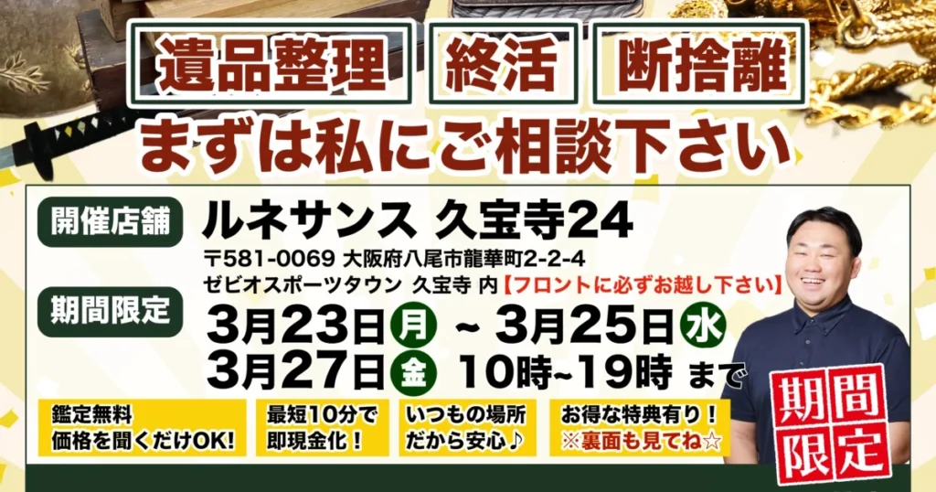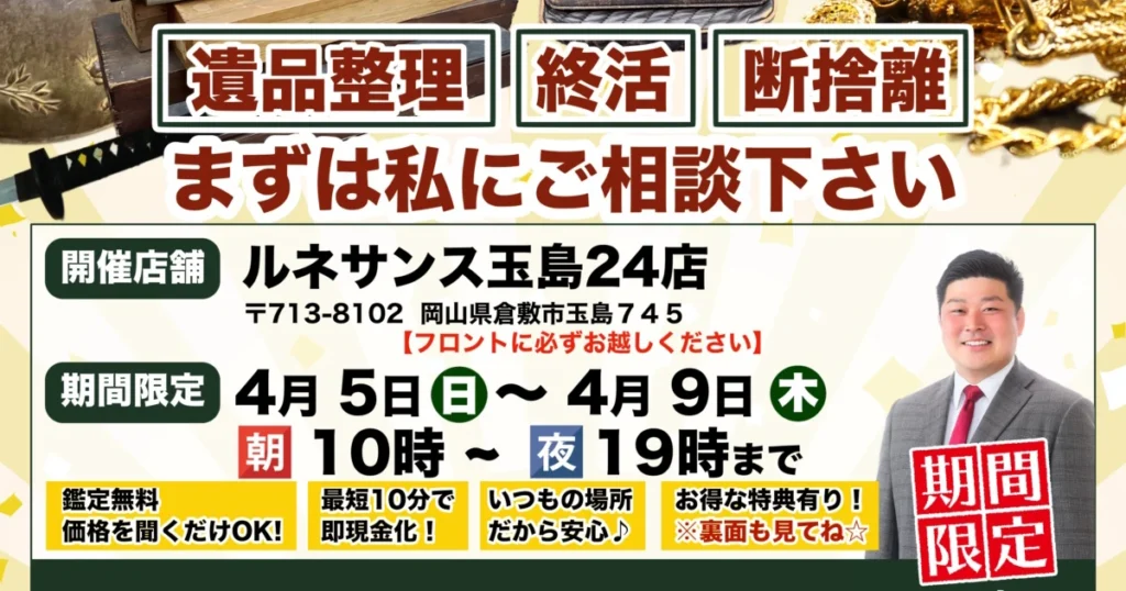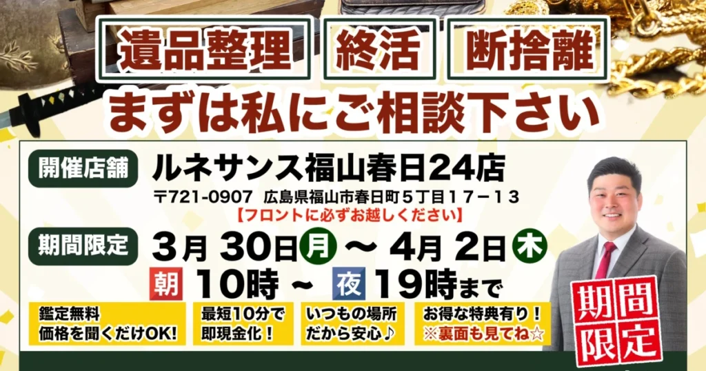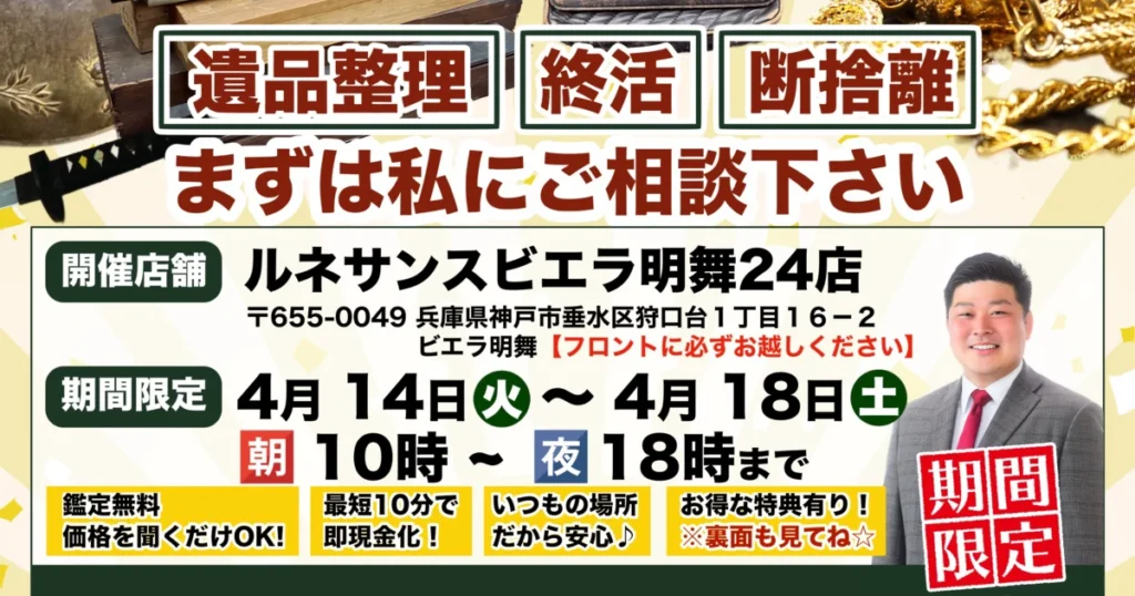 A. はい、私たちがお手伝いできることの一つです。 故人様が大切にされてきたお品物や、ご自身のこれからの人生のための整理など、お客様のお気持ちに深く寄り添いながら、心を込めて整理・査定させていただきます。ただの片付けではない、”ご縁”をつなぐお手伝いをいたします。